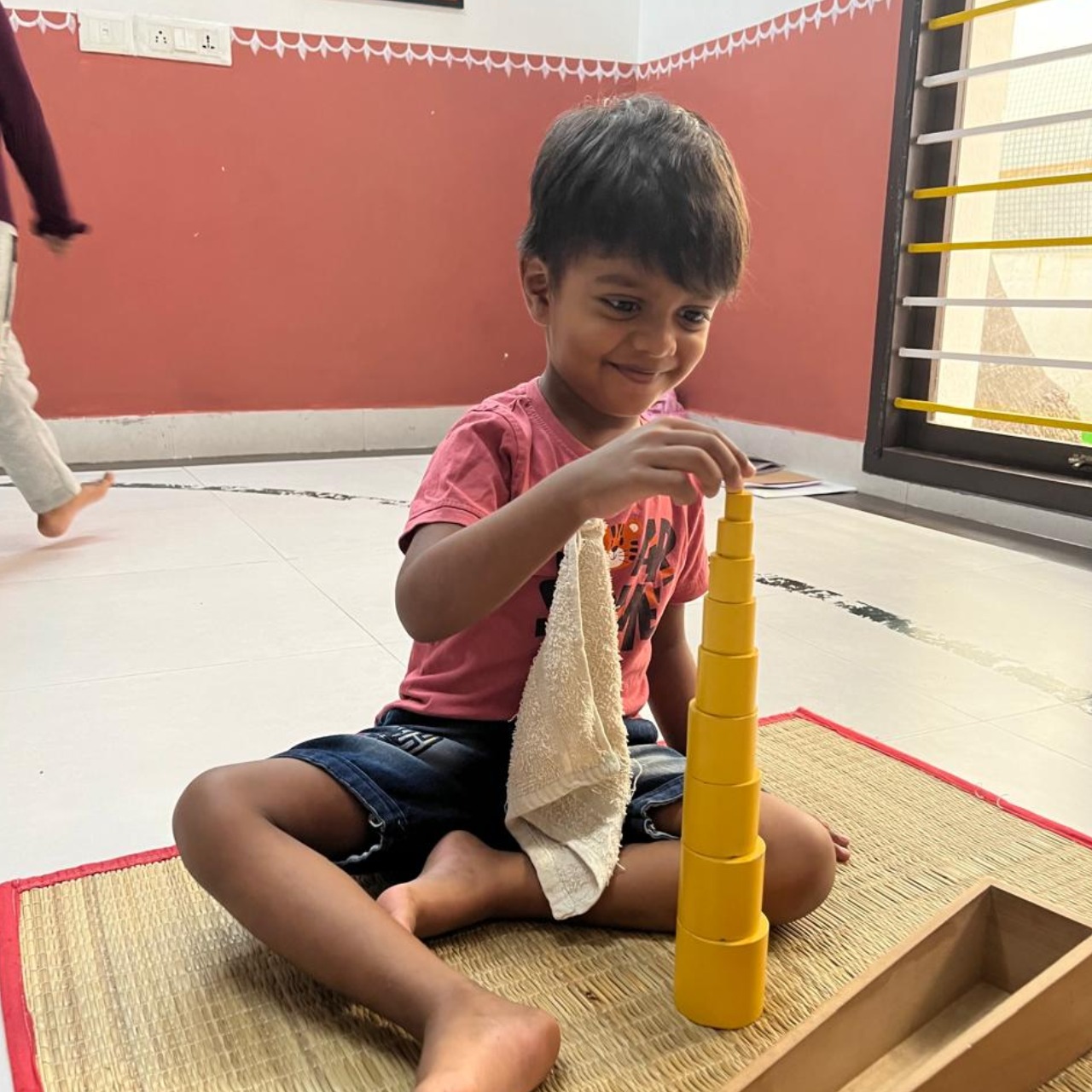 Practical Life & Sensorial Activity: The child is stacking yellow cylinders of different sizes, which is a classic Montessori exercise to refine visual discrimination of size, hand–eye coordination, and concentration. Fine Motor Skills: Carefully balancing and placing each cylinder helps strengthen finger muscles and coordination. Cognitive Development: By arranging the cylinders in the correct order, the child learns about sequencing, order, balance, and spatial awareness. Independence & Focus: Sitting on a mat and working individually shows the Montessori principle of giving children space to explore independently. Joy in Learning: The child’s smile reflects confidence, engagement, and enjoyment in the process of discovery. Prepared Environment: The clean, organized space with art on the walls and natural light supports a calm and inspiring learning environment